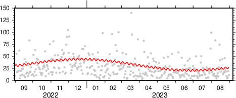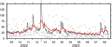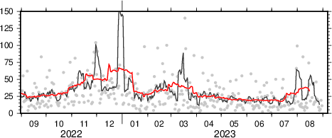 Moving averages over 7 days (black) and 30 days (red) for the last year.