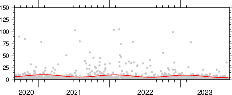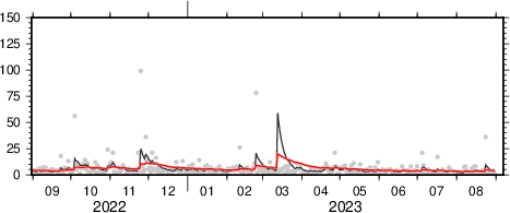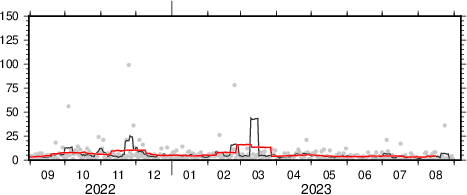 Moving averages over 7 days (black) and 30 days (red) for the last year.